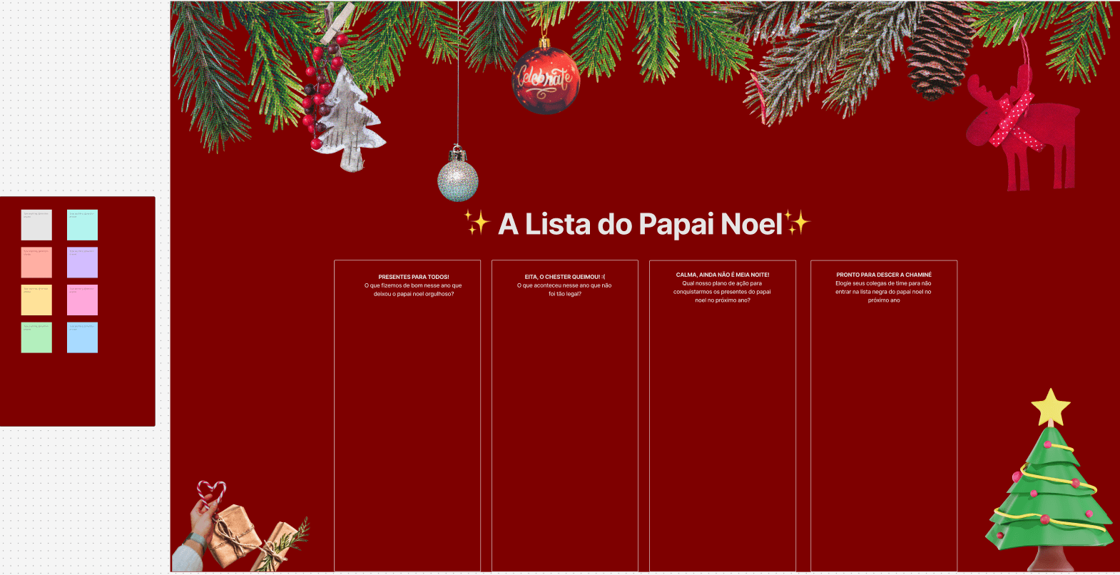Nessa dinâmica de fim de ano, o squad analisou as métricas dos quatro quarters, avaliou o que funcionou e o que não funcionou, e construiu coletivamente o backlog para o ano seguinte. Foi também um espaço de reconhecimento: entender o que o time entregou, como e por quê. A temática natalina foi escolha do grupo, e fez toda a diferença no engajamento.